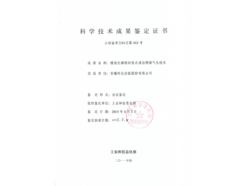 模块化梯级回热清洁燃煤气化系统鉴定证书