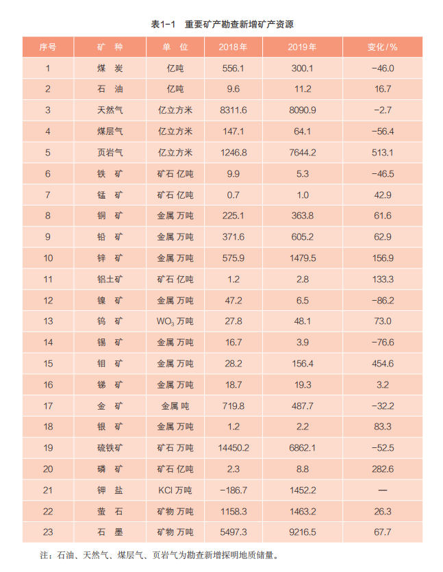 主要金属矿产中锰矿、铜矿、铅矿、锌矿、钨矿、钼矿、银矿等新增明显,铁矿、镍矿、锡矿、金矿明显下降。非金属矿产中磷矿、石墨明显增长。
